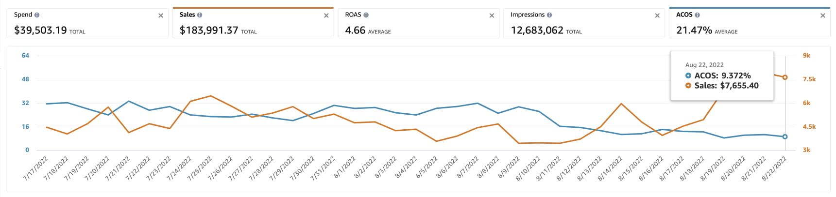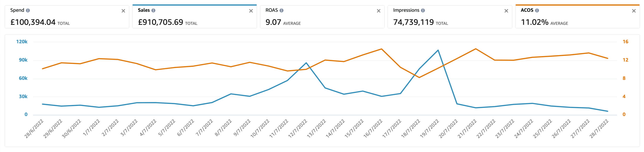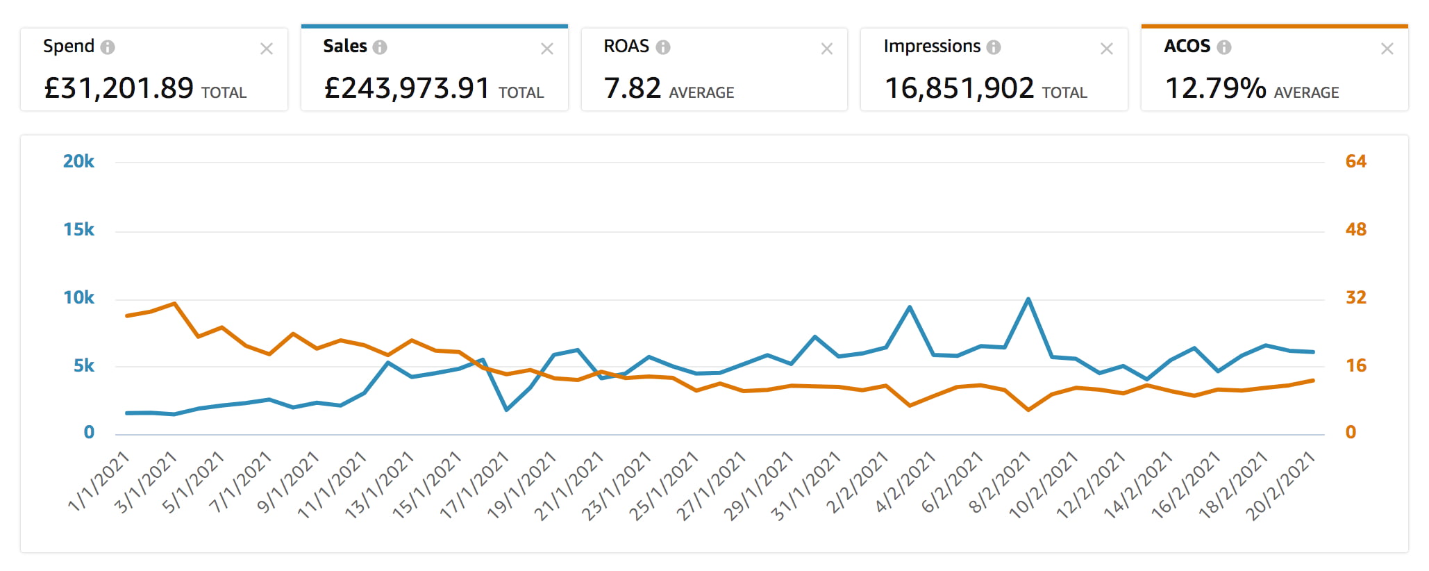 In this case, both objectives have been achieved with sales increasing in the same time period from roughly £5,000,000 last year to over £8,000,000 this year at an ACOS of less than 12% over the past 30 days.