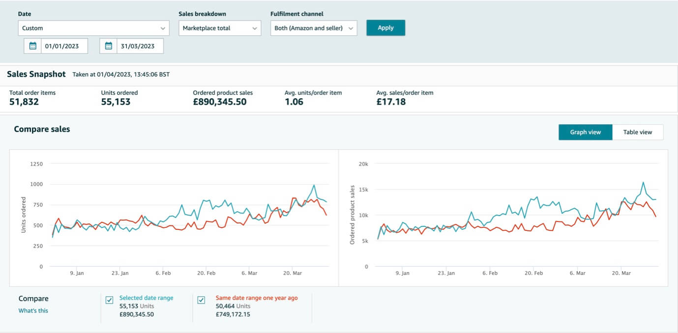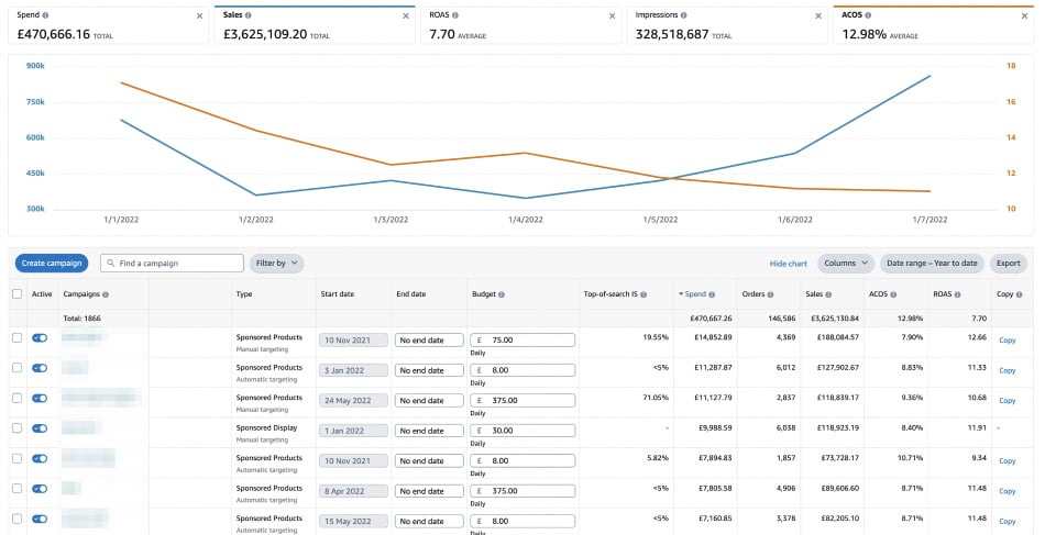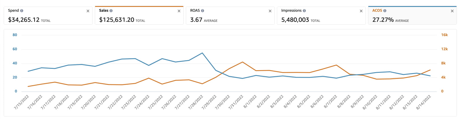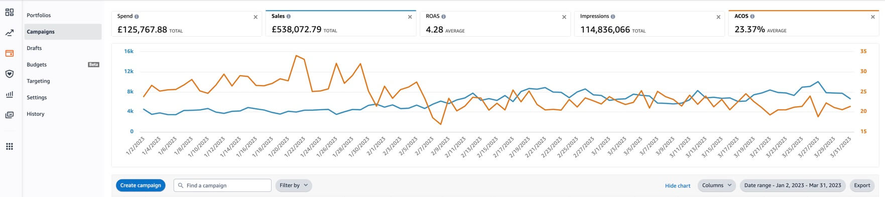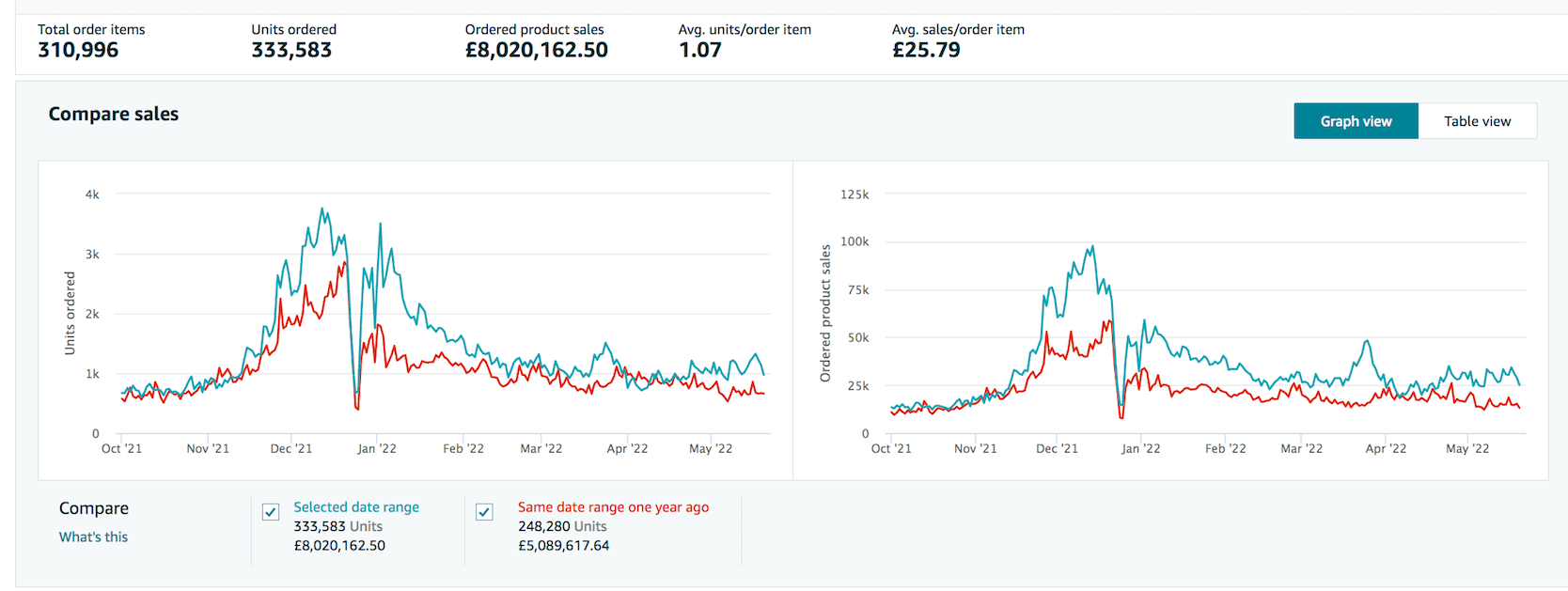 In this case, both objectives have been achieved with sales increasing in the same time period from roughly £5,000,000 last year to over £8,000,000 this year at an ACOS of less than 12% over the past 30 days.