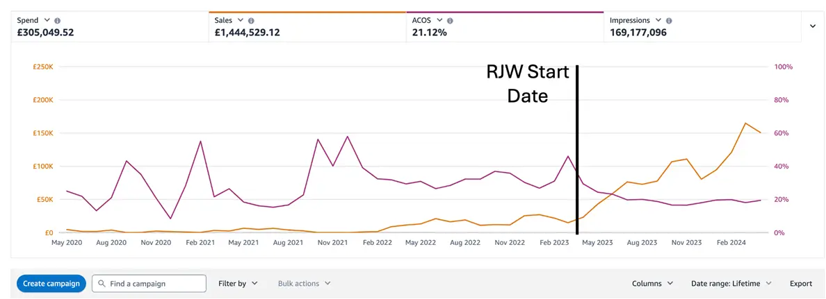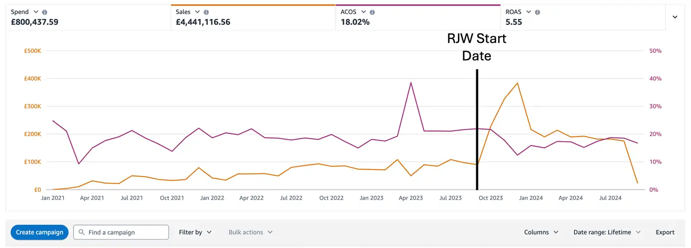 Before RJW, the best sales month for this business was £270,000 at a 24% ACOS in Dec 2020. With RJW, after 2 months of working together, a new record sales month of £400,000 at an 11% ACOS was achieved.