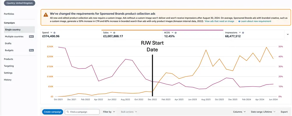 As for sponsored product ads, these were also available sporadically with some products only experiencing automatic targeting. In contrast, others were left with only limited manual targeting and most products benefited from no advertising. As soon as RJW started this had to change.